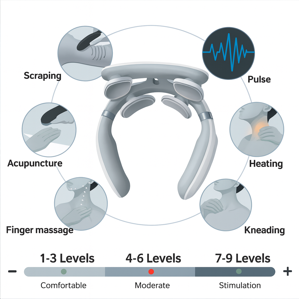 The device helps relieve everyday neck tension caused by long work hours, stress, or poor posture. It uses a combination of warming, pulse stimulation, and kneading to relax tight muscles. Many users feel lighter and more comfortable after just a few minutes of use. It is designed for daily relaxation and gentle muscle care.